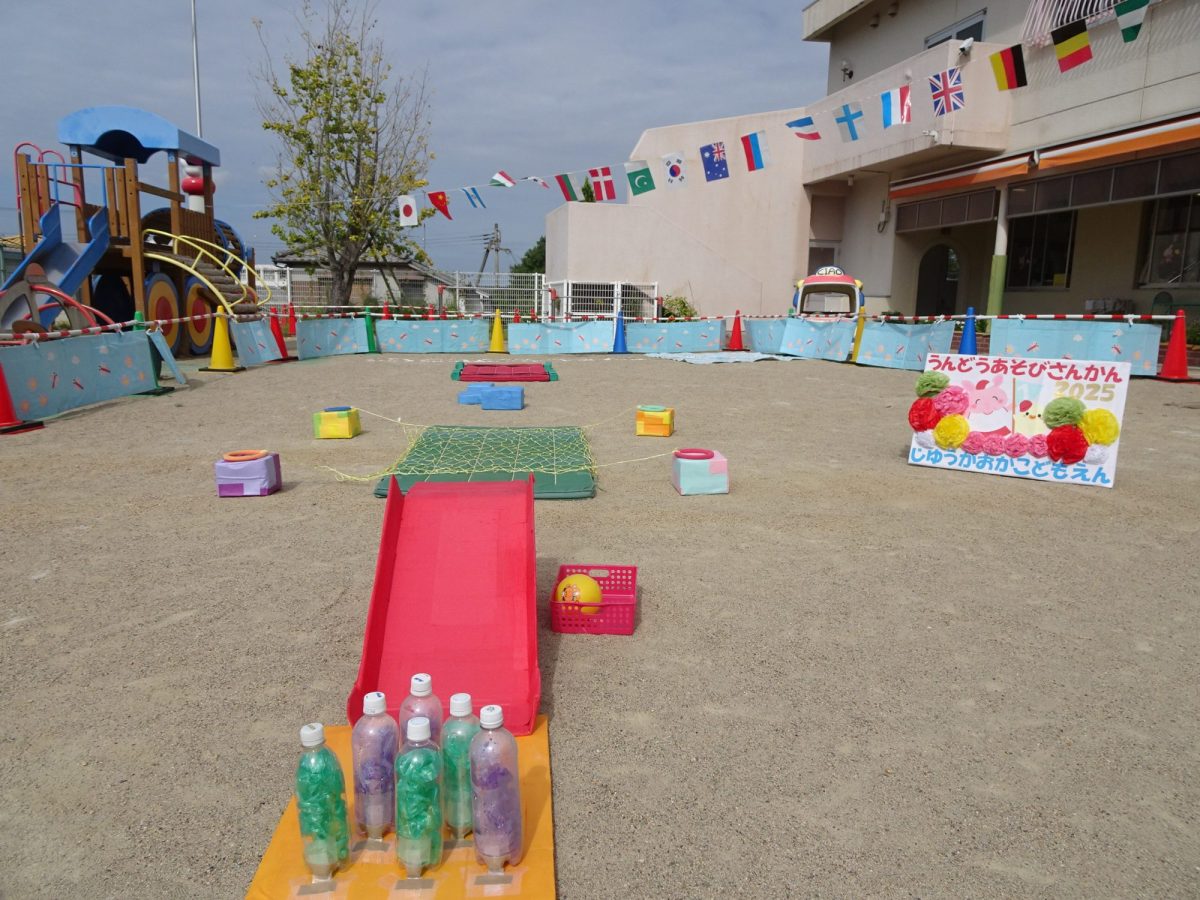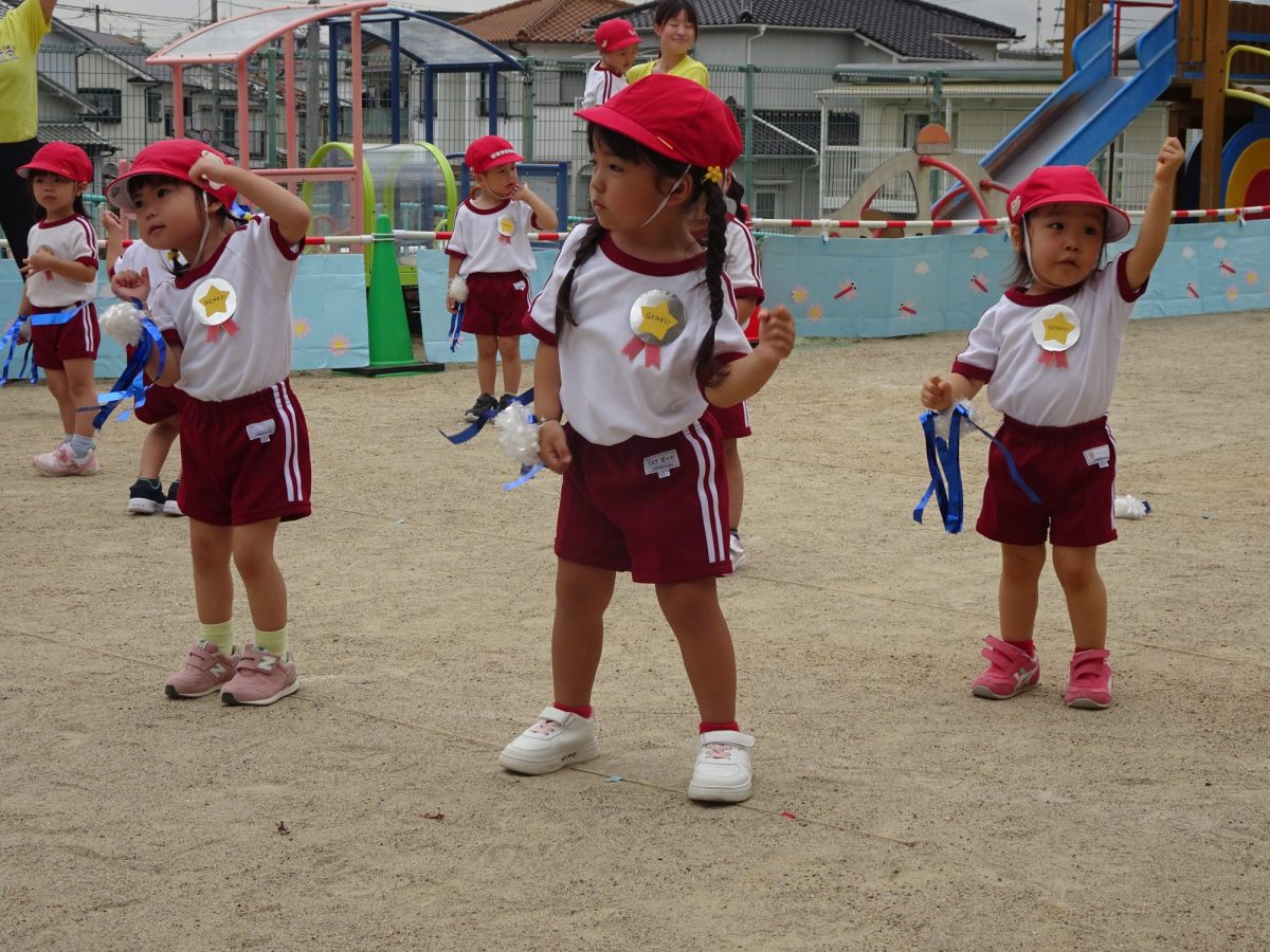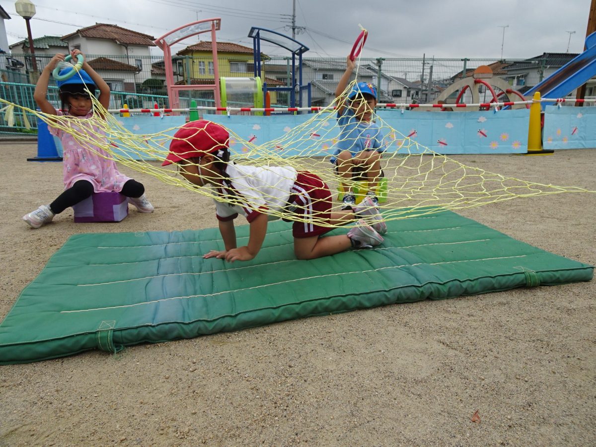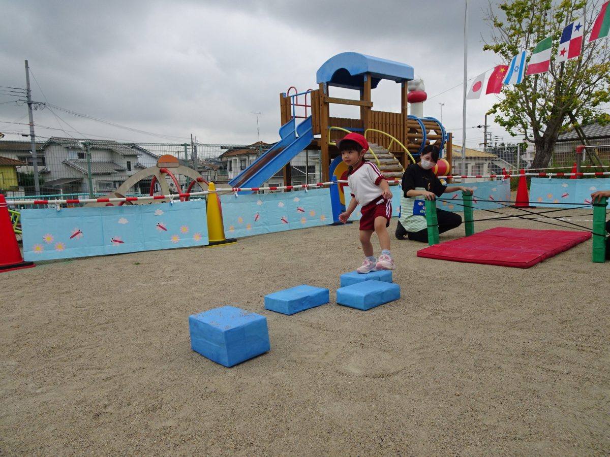 2歳児は、バランス台や網くぐりなどのわくわくサーキットをしました。年長児さんに網くぐりの網を持ってもらいました。ダンスも披露し、たくさんの拍手をいただきました。