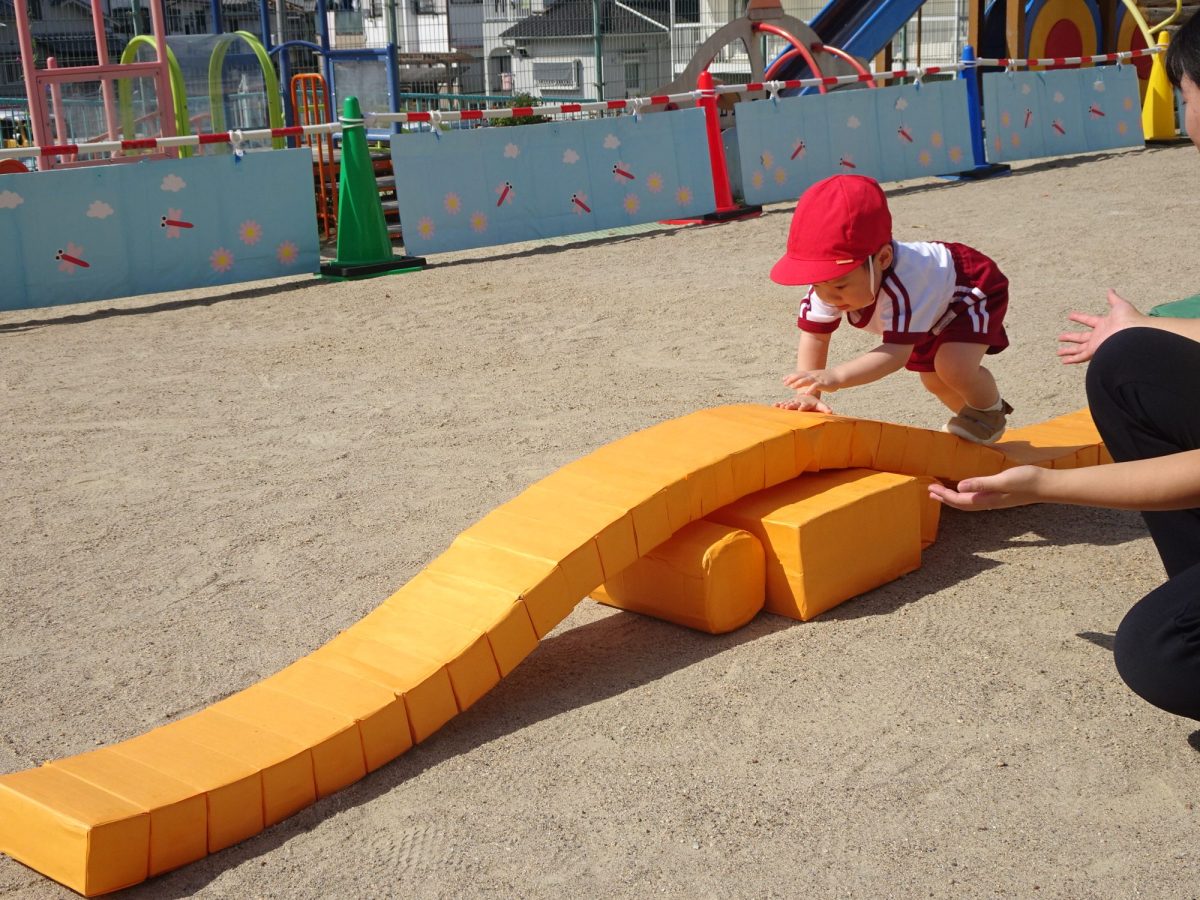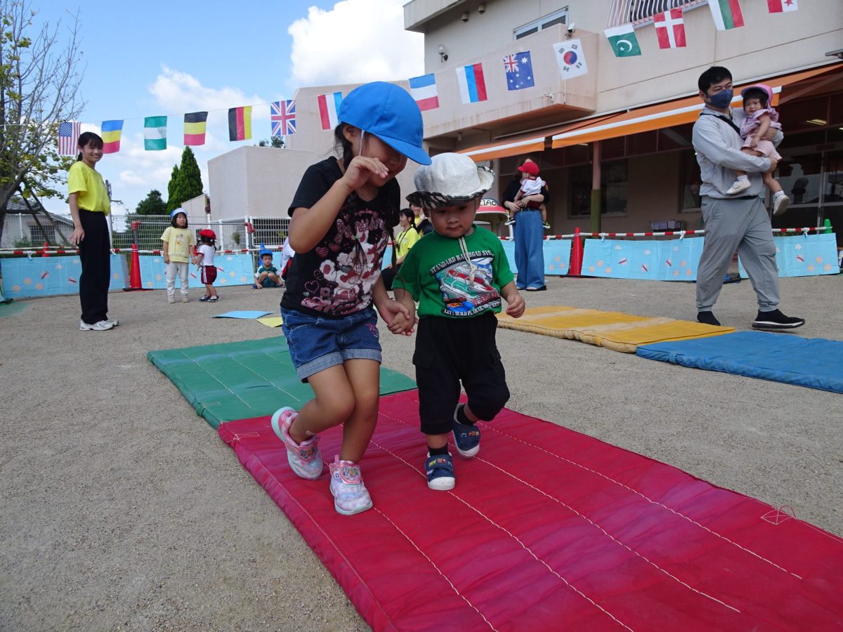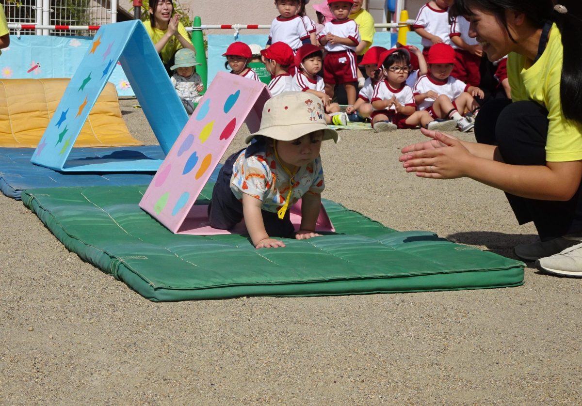 0、1歳児は、お山を乗り越え、三角のトンネルをくぐり、1歳児は、長い一本橋を渡って、高い所からジャンプ‼にも挑戦しました。また、親子競技では、保護者の方や年長児と一緒に楽しみ、動物なりきり遊びをしました。