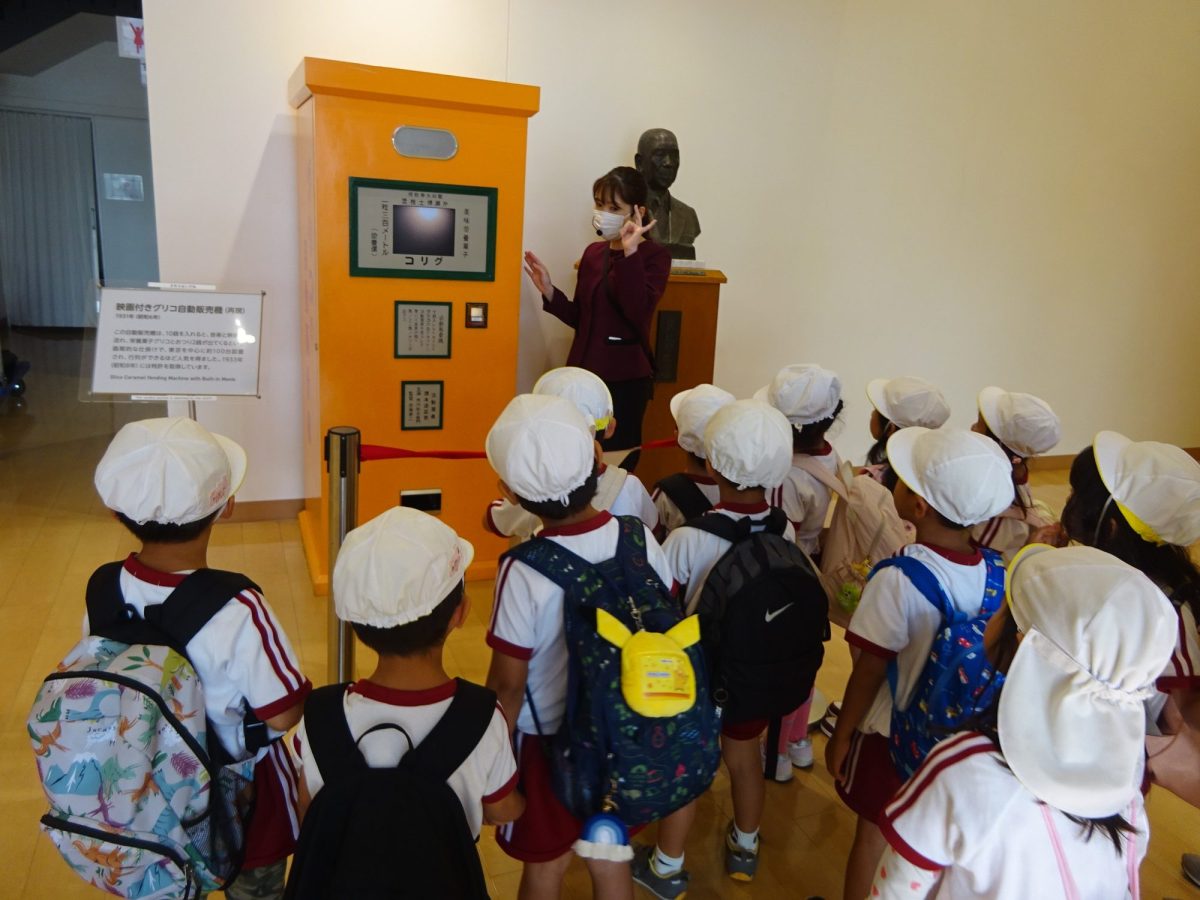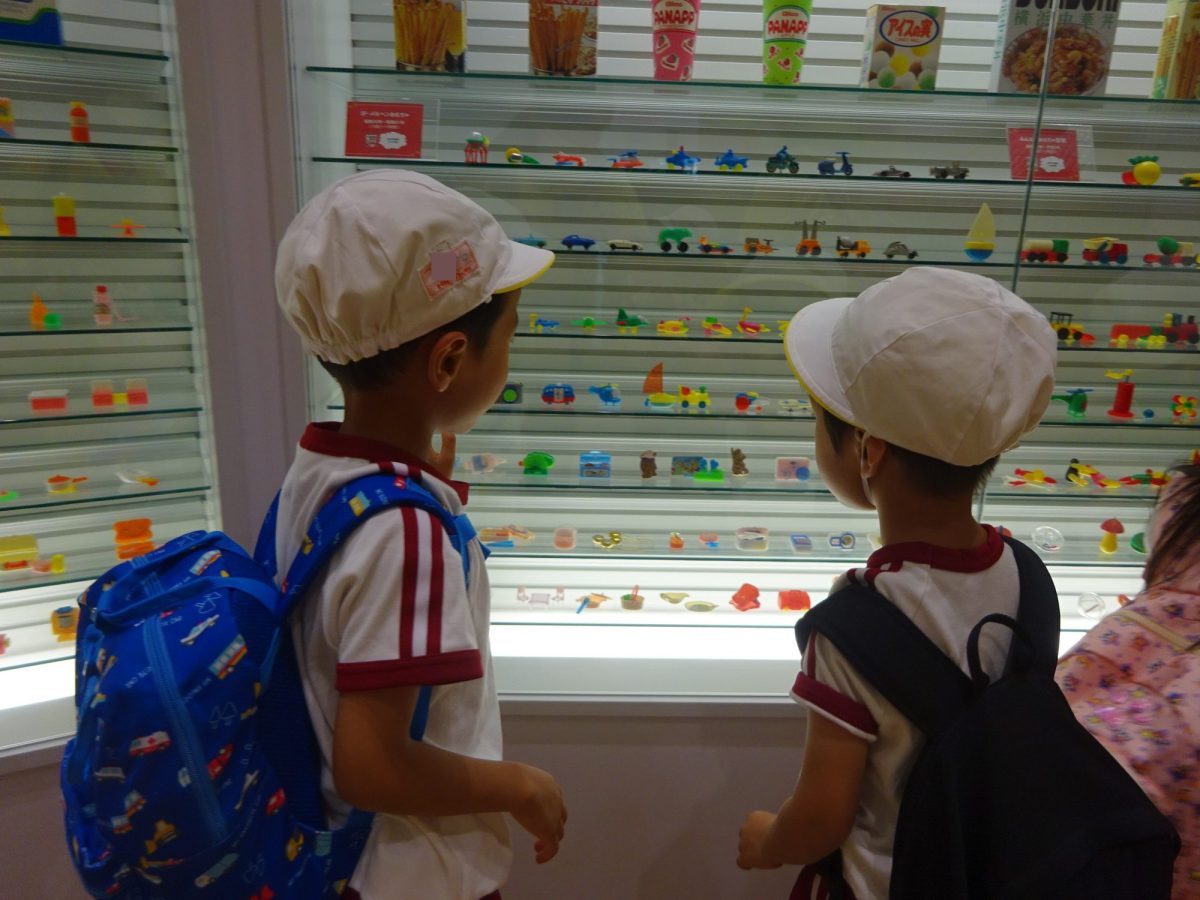 グリコピアの館内では、グリコの歴史を映像で見たり、昔の自動販売機を実際に見たり、工場では、流れるお菓子を眺め、「すごーい!」と驚いたりしていました。また、デジタルクッキングも体験し、様々な形のポッキーや、ビスコをデコレーションして楽しみました。昼食の時間には、保護者の方々が作ってくださったお弁当をうれしそうに見せてくれて、お友だちとおしゃべりを楽しみながら食べていました。