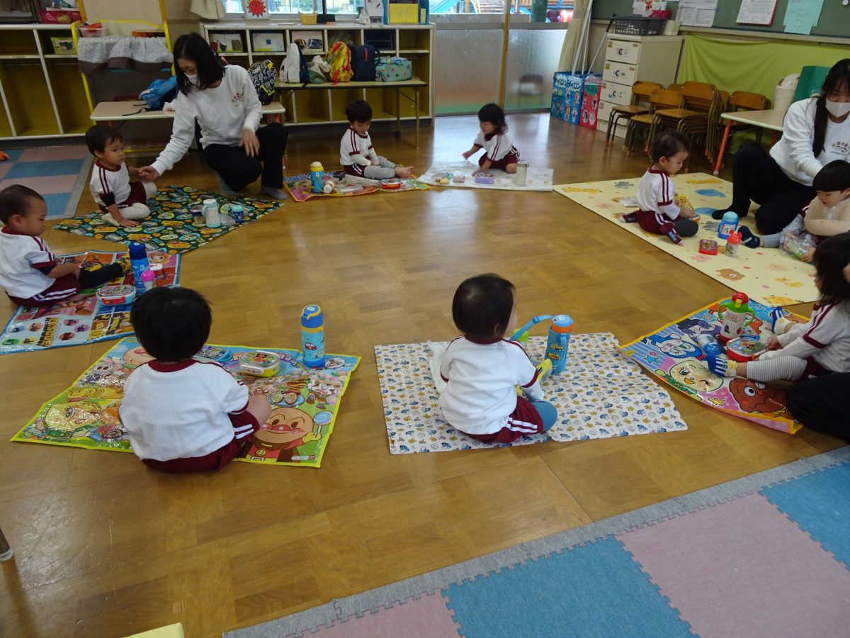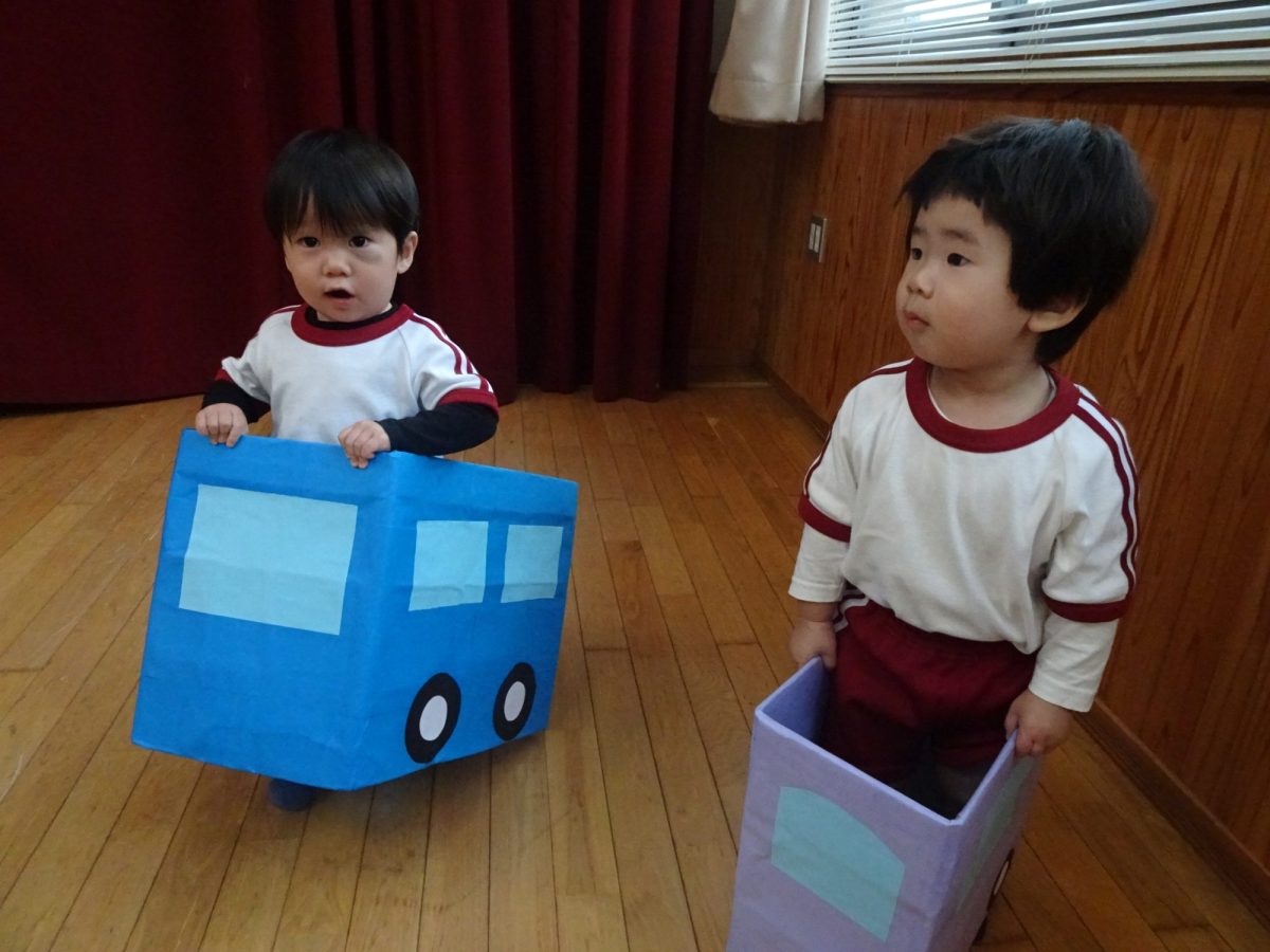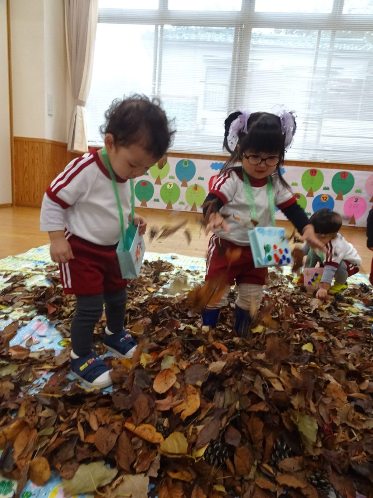 遊戯室に落ち葉やどんぐりを広げて、お絵かきやシールを貼って作ったオリジナルバックに、気に入ったどんぐりを黙々とバックに入れたり、保育者と一緒に落ち葉シャワーを楽しんだりしました。手作りバスは、♪バスごっこの歌を口ずさみながら、動き回って遊びました。昼食は、レジャーシートをひいて、お家の方に作っていただいたお弁当を食べ、特別な楽しい一日となりました。