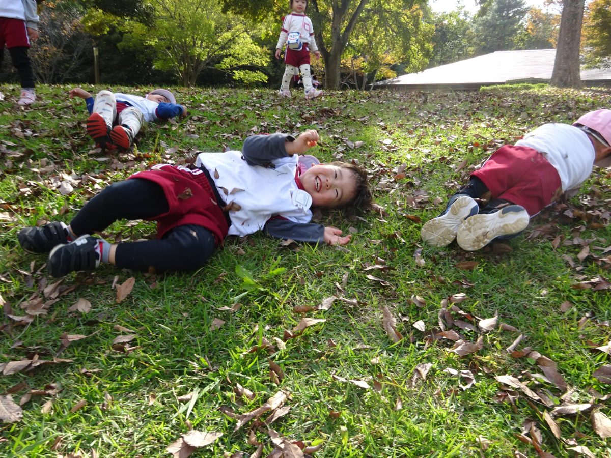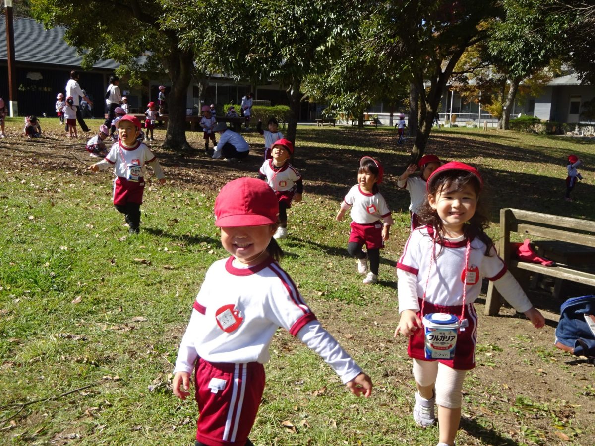 公園では、どんぐりや色づいた落ち葉を夢中になって拾い集め、「こんなにいっぱい!」や「ここにもあるよ!」と楽しそうな声が響いていました。