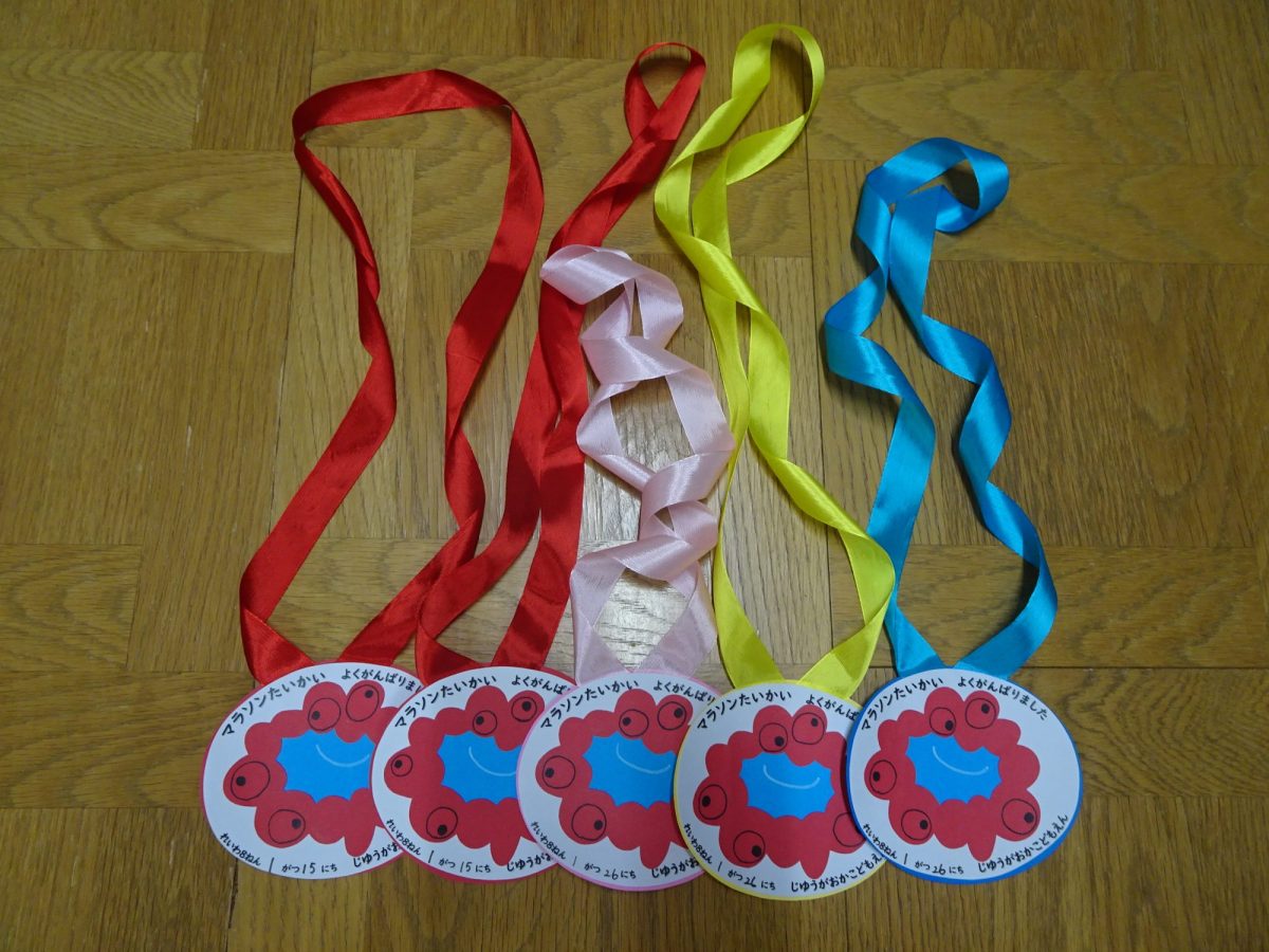 「よーいスタート!」の声で一斉に走り出した子どもたち。走る楽しさと、走り続ける苦しさを味わい、負けたくない!という強い気持ちも持って、最後までくじけずにゴールを目指す姿が見られました。ゴールした後は、園長先生からメダルをかけてもらい、ごほうびをもらって大満足の子どもたちでした。